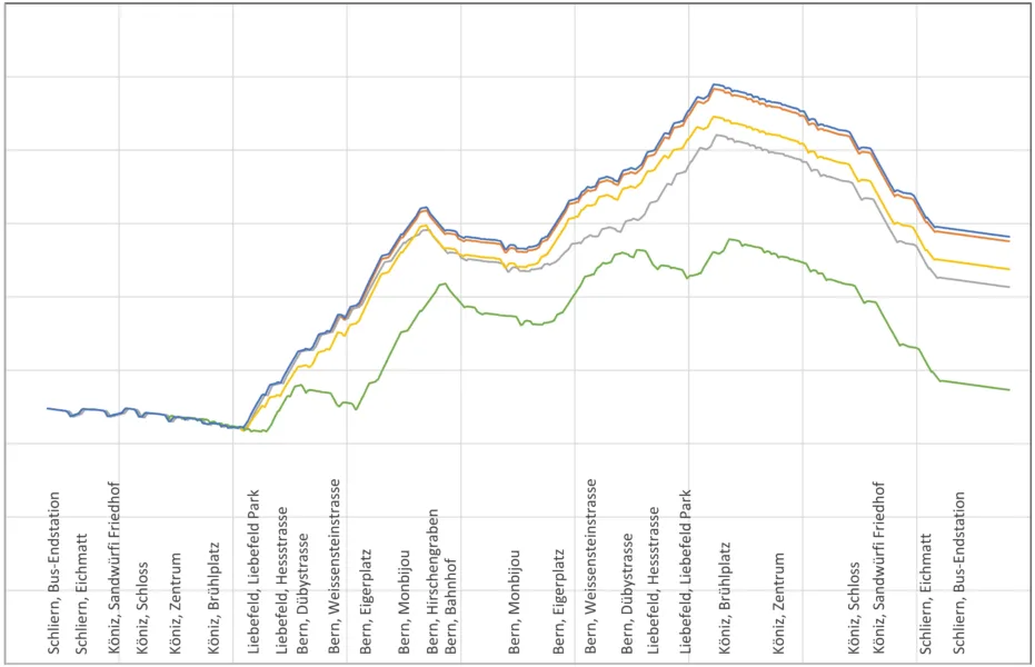 Anschliessend wurden die drei Speisevarianten, welche aus der Grundlagenstudie resultierten, von den Enotrac-Experten mittels Fabel-Simulationen im Detail untersucht. Die drei Varianten unterscheiden sich einerseits im Grad der Elektrifizierung, also in der Länge der Oberleitung, sowie in der Anzahl und den Standorten von Gleichrichtern und Ladeinfrastrukturen. Für die Untersuchung wurde die Linie 10 von Bern Bahnhof bis Köniz Schliern in einem Simulationsmodell für dynamische Lastflussrechnungen erfasst. Mit diesem Modell wurden anschliessend diverse Netzschalt- und Betriebsszenarien simuliert. Ermittelt wurden so der Energie-Umsatz pro Umlauf zur Dimensionierung des Energiespeichers, die Spannungshaltung entlang den elektrifizierten Streckenabschnitten und die Belastung der Gleichrichteranlagen und der Ladeinfrastrukturen sowie der Speise- und Rückleiterkabel und der Oberleitungsanlage. Basierend auf diesen Ergebnissen kann nun die Planung der effektiv umzusetzenden Speisevariante gestartet werden.