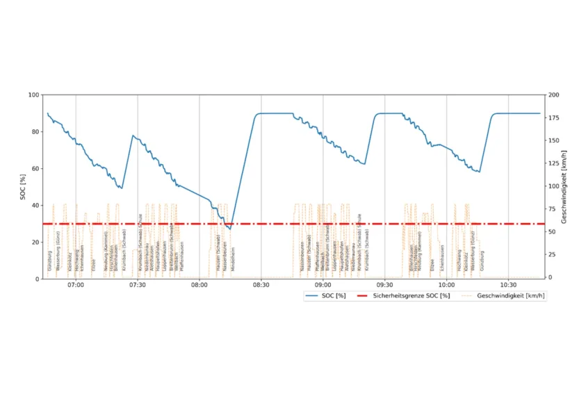 Aus den Simulationen liess sich anschliessend die Bestvariante für einen stabilen und robusten batterieelektrischen Verkehr (BEMU-Verkehr; Battery-electric multiple unit) ableiten. So konnten der dafür notwendige Elektrifizierungsgrad bestimmt und die erforderlichen Bahnstromanlagen definiert werden.