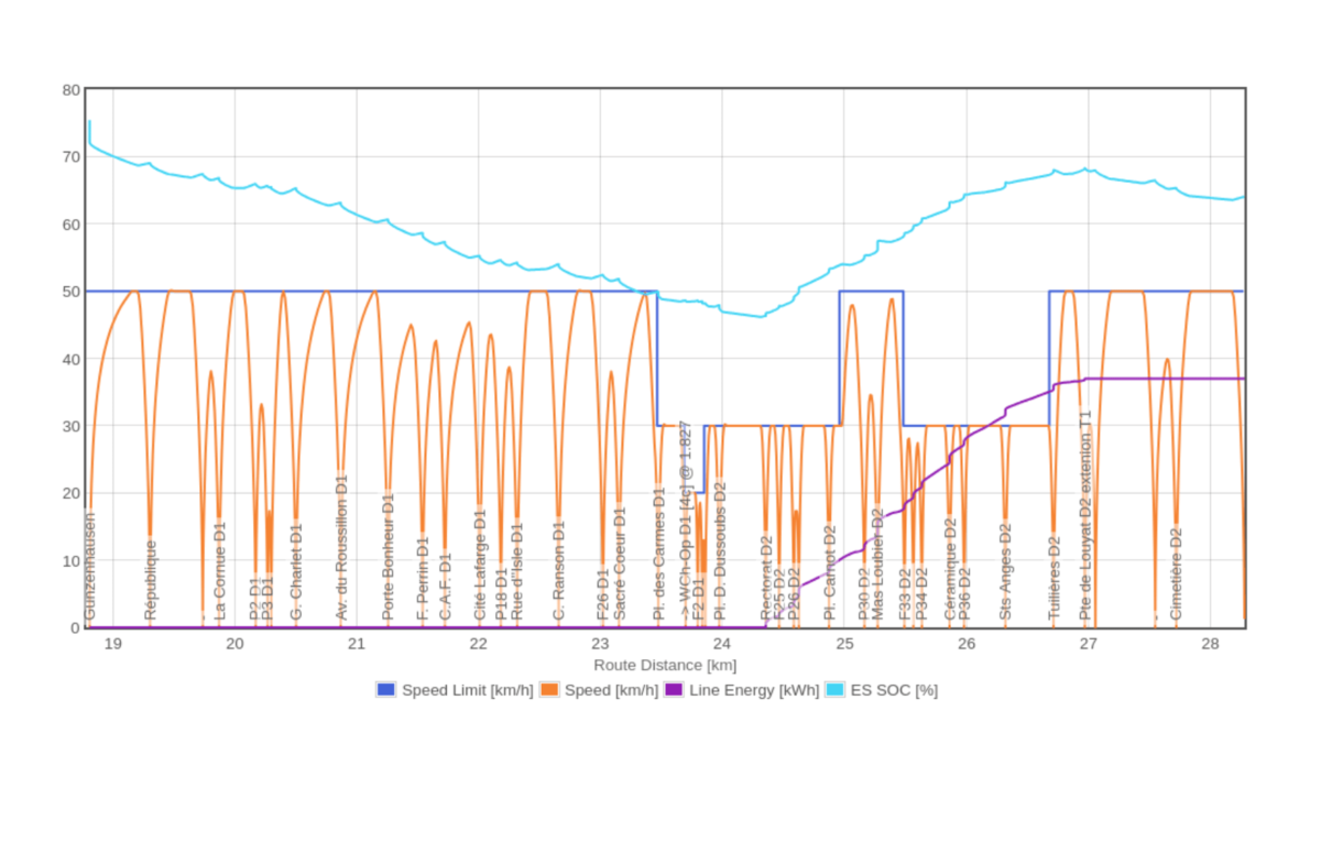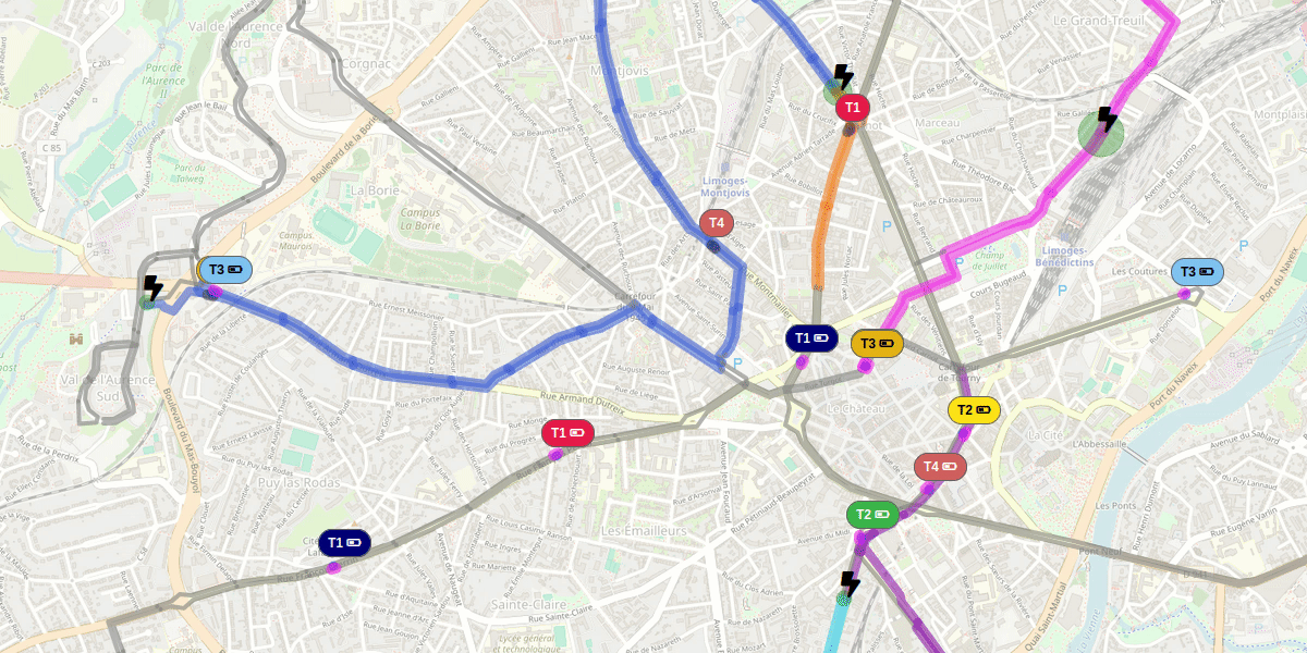 Enotrac modellierte zunächst das Trolleybusnetz von Limoges im aktuellen Zustand (2024) mit seinem Software-Tool Fabel und überprüfte die Dimensionierung der aktuellen Anlagen für die Betriebsfälle im Normalbetrieb (alle Unterstationen in Betrieb) aber auch mit ausgefallenen Unterwerken.