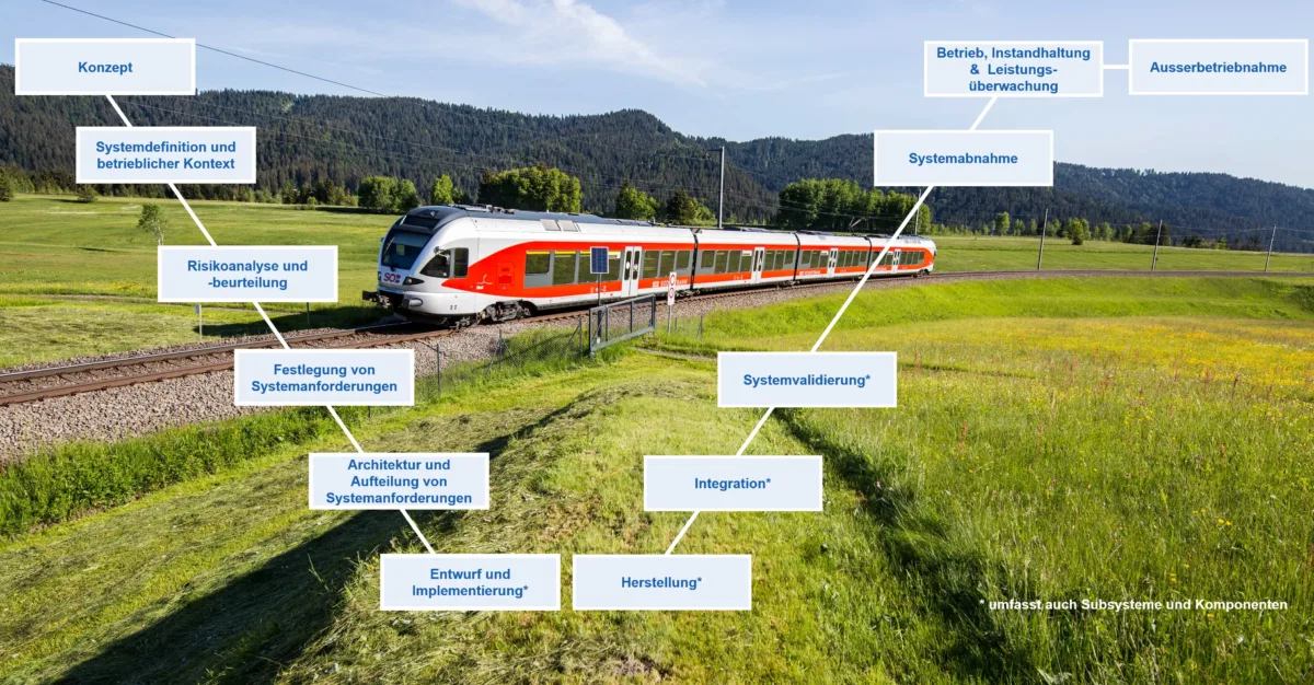 Enotrac steht Ihnen als zuverlässiger Partner in jeder Phase des Lebenszyklus Ihrer Fahrzeuge zur Seite, von der ersten Konzeptidee bis hin zur Ausserbetriebnahme. Gemäss dem V-Modell der Norm EN 50126 begleiten wir Sie über alle Phasen hinweg mit unserem umfassenden Know-how in der Fahrzeugtechnik. Unsere Expertise erstreckt sich über die präzise Definition der Systemanforderungen und -entwürfe, die sorgfältige Durchführung von Risikoanalysen, bis hin zur Integration, Validierung und Inbetriebnahme. Dabei legen wir höchsten Wert auf Sicherheit und Zuverlässigkeit, damit Ihr Projekt über den gesamten Lebenszyklus hinweg optimal betreut ist.