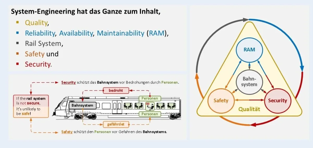 Beim System Engineering geht es um das Zusammenspiel von Qualität, «Reliability, Availability, Maintainability» (RAM) und Sicherheitsfragen («Safety» and «Security») im Bahnsystem.