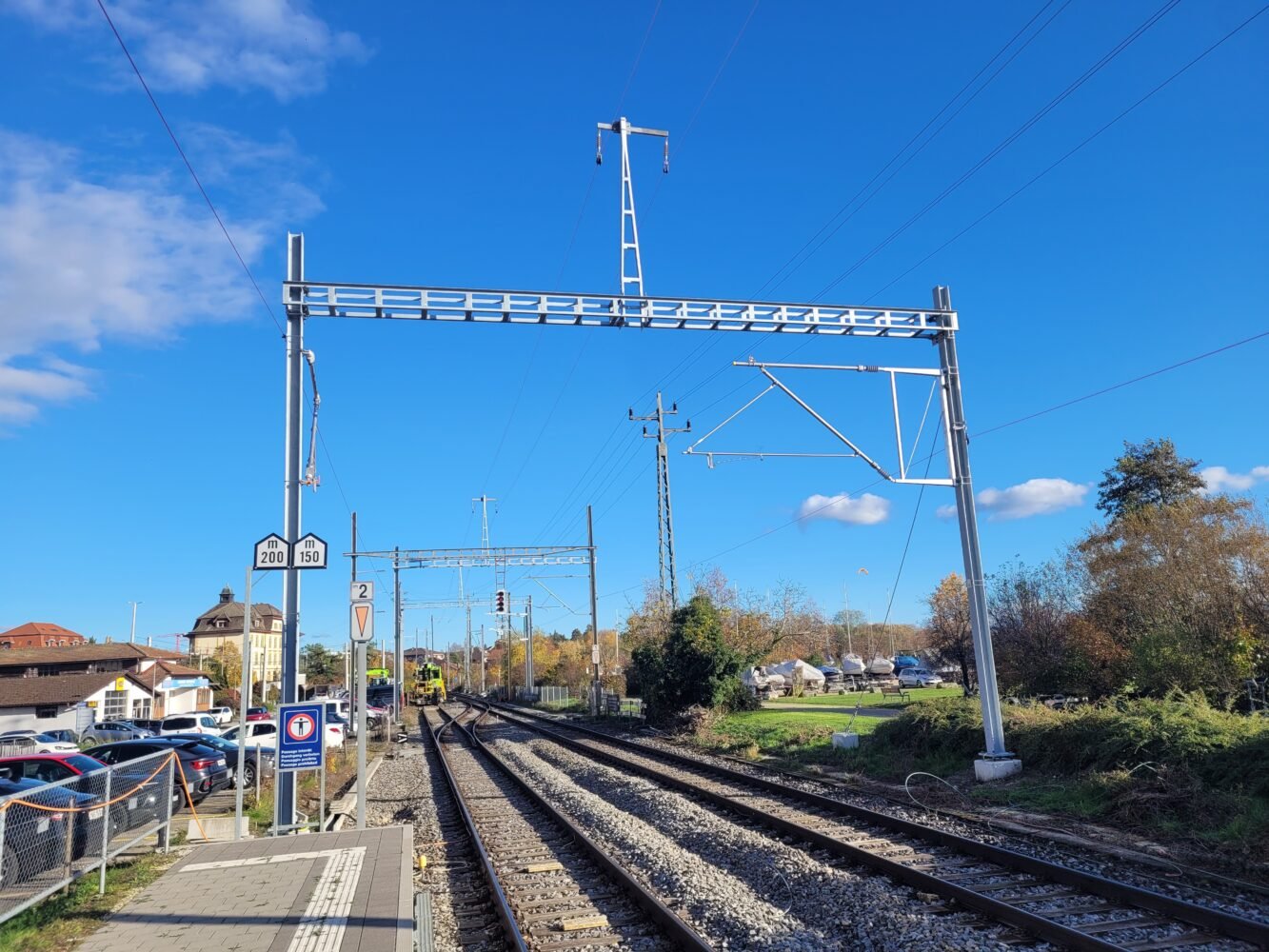 The existing catenary system at St. Blaise-Lac station no longer met current technical requirements and had reached the end of its service life. As part of the complete renovation, the catenary system was converted to a fully tensioned system and, at the same time, the conductor cross-sections were reinforced to ensure future power requirements could be met. The neighbouring SBB 66kV transmission line posed a particular challenge, as the necessary safety distances had to be ensured in accordance with the Line Ordinance and AB-EBV.